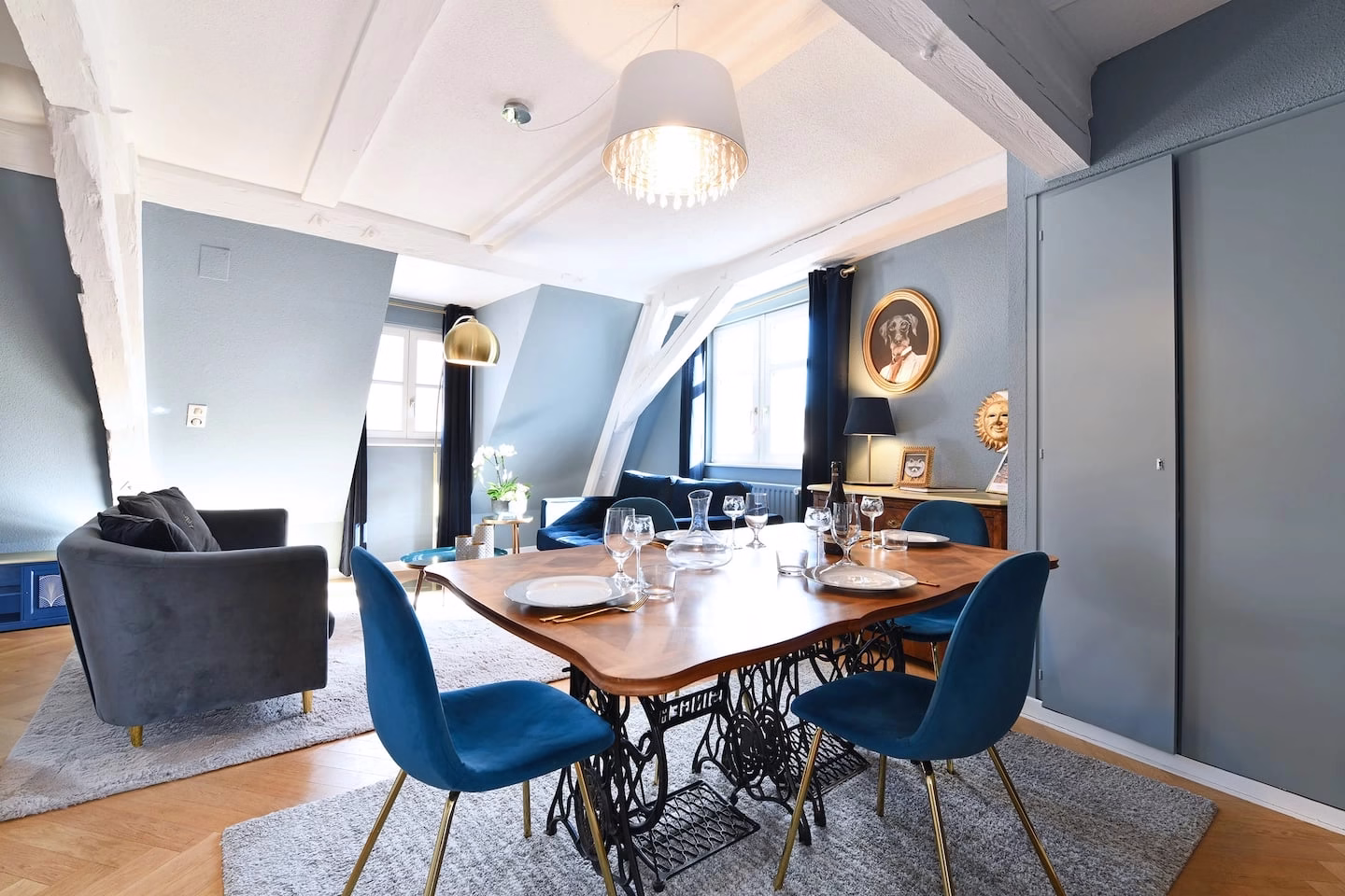 « Fly me to the moon » est un appartement romantique de 70 m2 en duplex, au dernier étage. Vous aurez une délicieuse vue sur les toits de Colmar et son ciel étoilé, so cute! La décoration entièrement pensée par Cathy est résolument intimiste avec ses tableaux magnifiques partout dans l’appartement, ses tapisseries très chic, le tout dans des tons bleus et dorés. Les meubles ont été chinés selon leur qualité de bois en harmonie avec le parquet. Il est situé à 50 m de la célèbre Petite Venise.